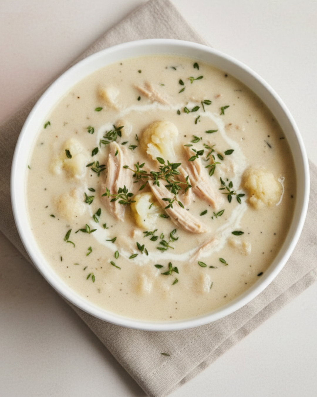 This high-protein cream of turkey and cauliflower soup is a complete and light meal suitable for lunch or dinner, especially when you need increased protein intake and blood sugar control. Turkey fillet is a source of pure, high quality, low-fat animal protein that supports muscle recovery and long-lasting satiety. Cauliflower provides fiber, vitamin C and bioactive compounds with anti-inflammatory effects while maintaining a low glycemic load of the meal. Carrots and onions add natural sweetness and antioxidants, and low-fat milk or yogurt give a creamy texture without excess calories. The combination of vegetables, protein and a moderate amount of fat makes this soup suitable for insulin resistance, weight reduction and recovery after exercise.